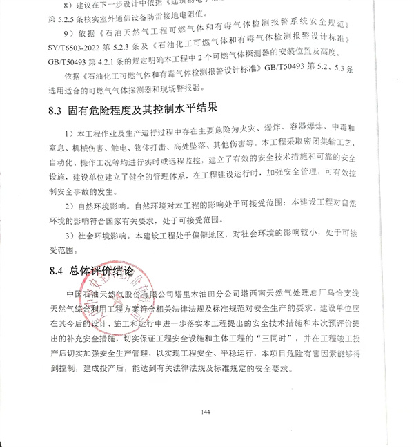 中国石油天然气股份有限公司塔里木油田分公司塔西南天然气处理总厂乌恰支线天然气综合利用工程方案符合相关法律法规及标准规范对安全生产的要求。建设单位应在其今后的设计、施工和运行中进一步落实本工程提出的安全技术措施和本次预评价提出的补充安全措施,切实保证工程安全设施和主体工程的“三同时”,并在工程竣工投产后切实加强安全生产管理,以实现工程安全、平稳运行,本项目危险有害因素能够得到控制,建成投产后,能达到有关法律法规及标准规定的安全要求。 |