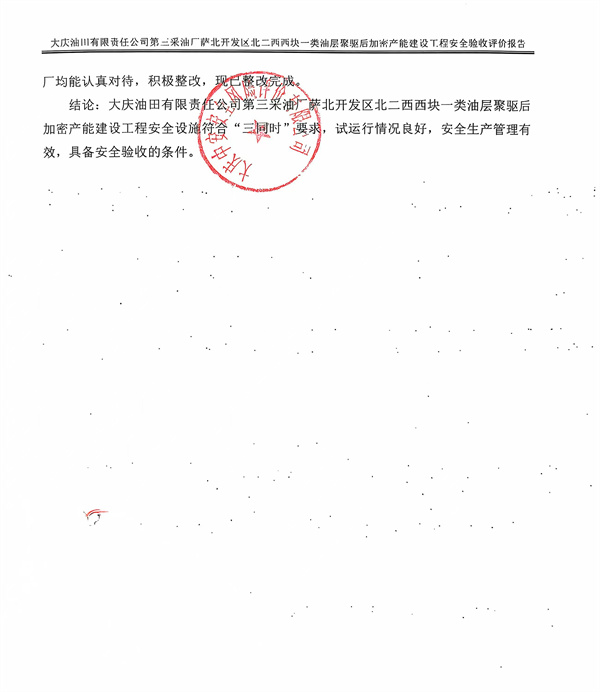 大庆油田有限责任公司第三采油厂萨北开发区北二西西块一类油层聚驱后加密产能建设工程安全验收评价报告 |
