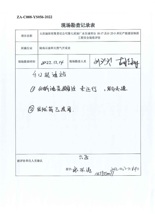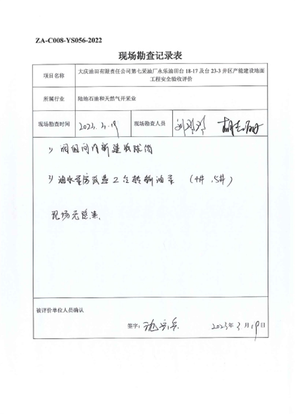 大庆油田有限责任公司第七采油厂永乐油田台18-17及台23-3井区产能建设地面工程设计、施工、试运行管理和监督制度齐全,安全设施、设备、装置与主体工程同时设计、同时施工、同时投入生产和使用,试运行情况良好,安全生产管理有效,具备安全验收条件。 |