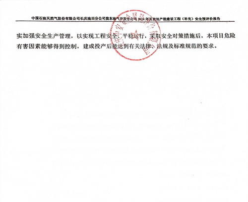 中国石油天然气股份有限公司长庆油田分公司陇东油气开发分公司2024年页岩油产能建设工程(补充)建设方案采取的安全技术措施和安全设施符合国家相关法律、法规、标准、规范的要求。采用的工艺方案和集输方案安全可行。建设单位应在其今后的设计、施工和运行中进一步落实本工程方案提出的安全技术措施和本次预评价提出的补充安全措施,切实保证工程安全设施和主体工程的“三同时”,并在工程竣工投产后切实加强安全生产管理,以实现工程安全、平稳运行,采取安全对策措施后,本项目危险有害因素能够得到控制,建成投产后能达到有关法律、法规及标准规范的要求。 |