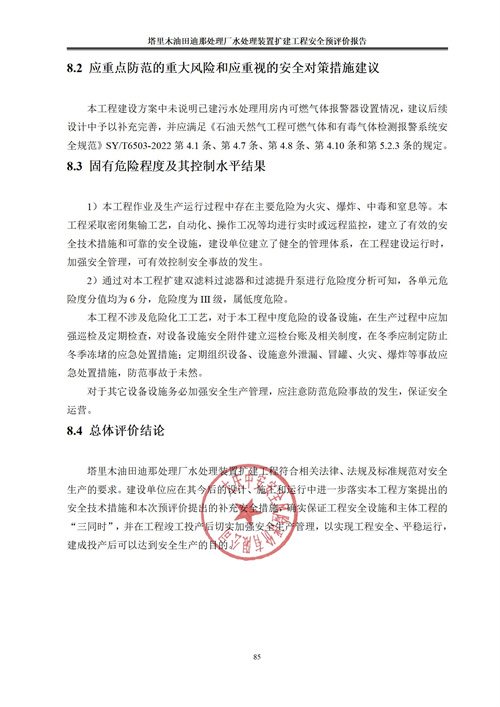 塔里木油田迪那处理厂水处理装置扩建工程符合相关法律、法规及标准规范对安全生产的要求。建设单位应在其今后的设计、施工和运行中进一步落实本工程方案提出的安全技术措施和本次预评价提出的补充安全措施,确实保证工程安全设施和主体工程的“三同时”,并在工程竣工投产后切实加强安全生产管理,以实现工程安全、平稳运行,建成投产后可以达到安全生产的目的。 |
