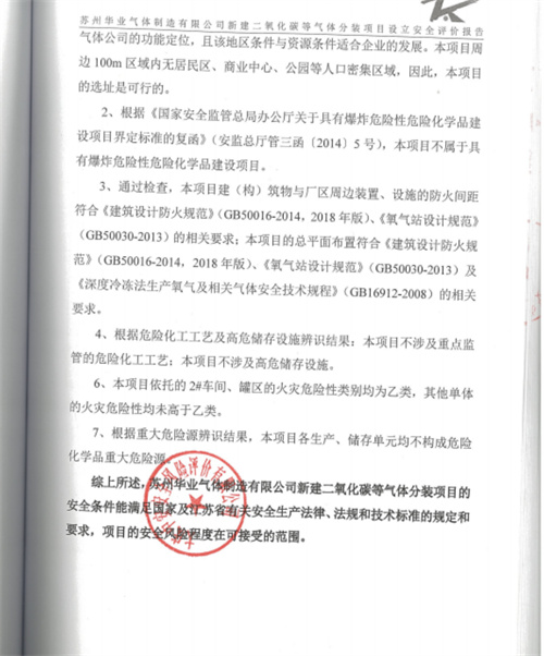 苏州华业气体制造有限公司新建二氧化碳等气体分装项目的安全条件能满足国家及江苏省有关安全生产法律、法规和技术标准的规定和要求,项目的安全风险程度在可接受的范围。 |