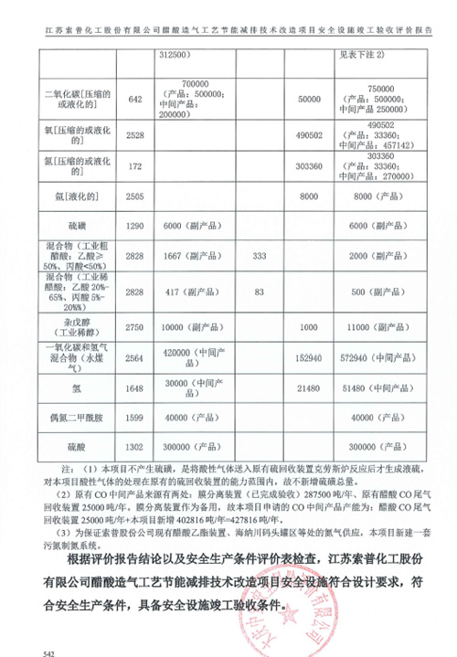 江苏索普化工股份有限公司醋酸造气工艺节能减排技术改造项目安全设施符合设计要求,符合安全生产条件,具备安全设施竣工验收条件 |