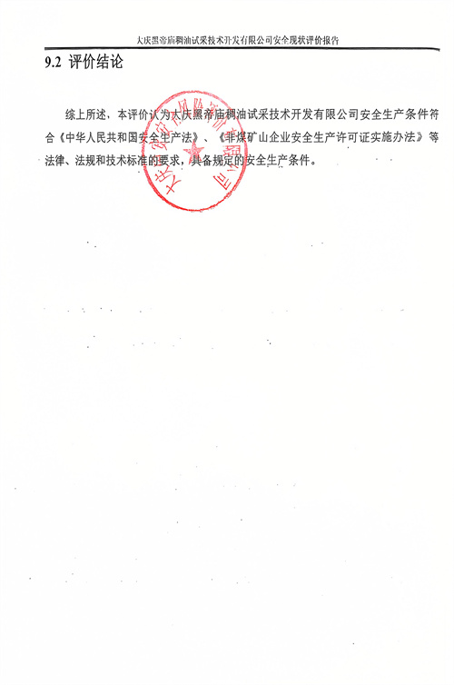 本评价认为大庆黑帝庙稠油试采技术开发有限公司安全生产条件符合《中华人民共和国安全生产法》、《非煤矿山企业安全生产许可证实施办法》等法律、法规和技术标准的要求,具备规定的安全生产条件。 |