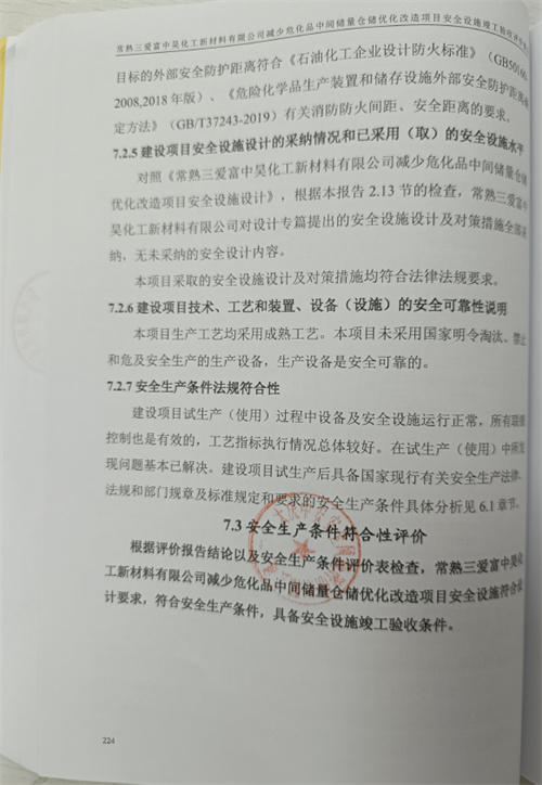 常熟三爱富中昊化工新材料有限公司减少危化品中间储量仓储优化改造项目安全设施符合设计要求,符合安全生产条件,具备安全设施竣工验收条件 |