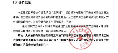 本工程项目严格执行建设项目“三同时”,项目设计方案进行了安全预评价并通过评审。该工程项目从初步设计到项目的施工建设,从工程的开工投产到试运行阶段,安全措施合理可行,并在设计和施工中得到落实、实施。 通过现场安全评价,对评价单位通过安全检查和评价发现的安全隐患,建设单位均能认真对待,积极整改,现已全部整改完成。 结论:大庆油田有限责任公司第三采油厂萨北开发区东部过渡带三、四条带北区加密调整产能建设地面工程安全设施符合“三同时”要求,试运行情况良好,安全生产管理有效,具备安全验收的条件。 |