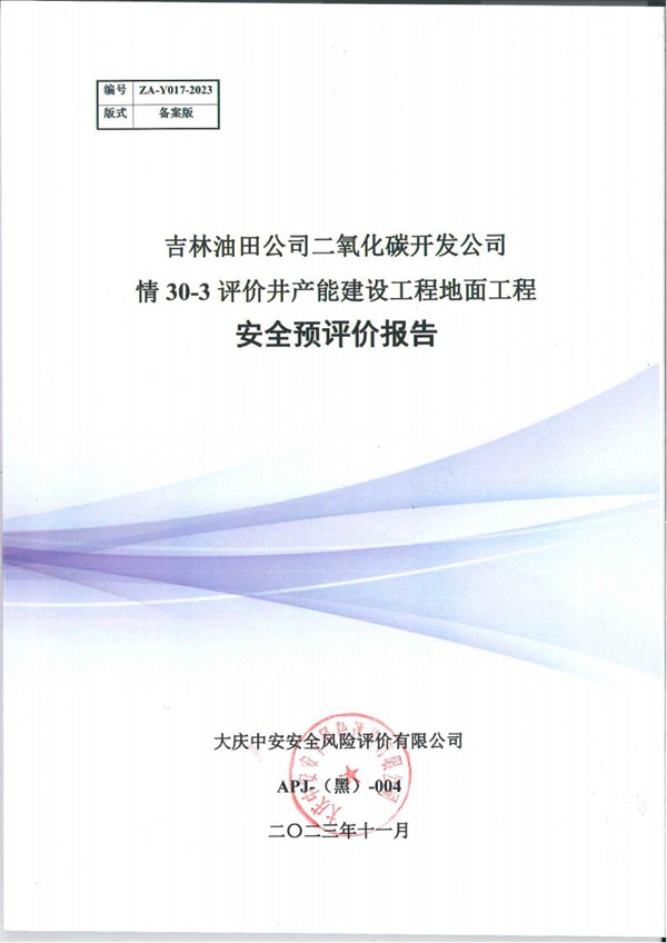 吉林油田公司二氧化碳开发公司情30-3评价井产能建设工程地面工程 安全预评价 |