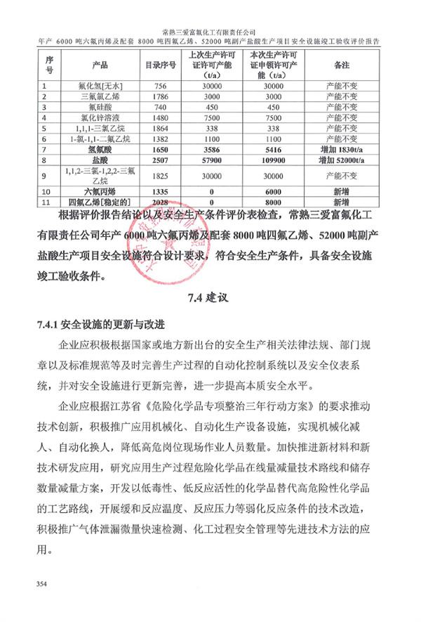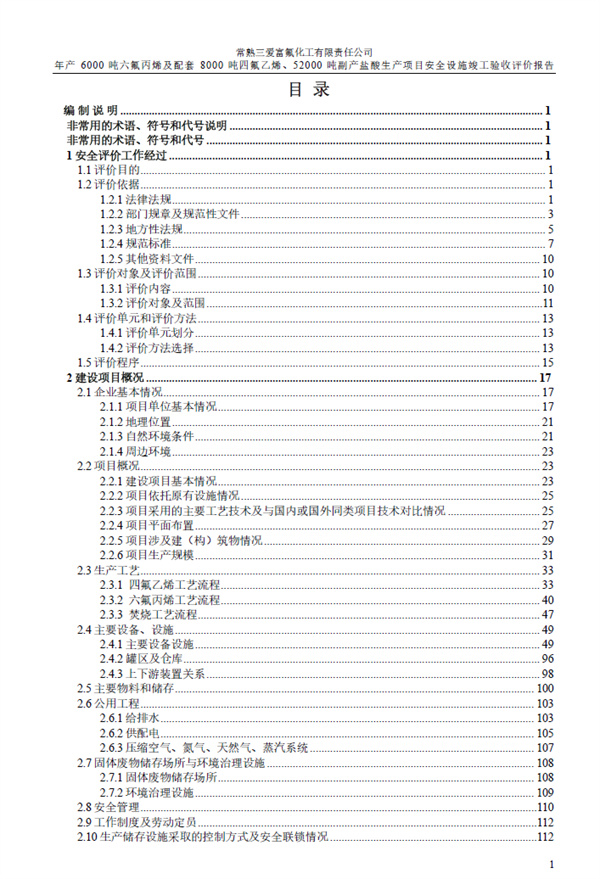 常熟三爱富氟化工有限责任公司年产6000吨六氟丙烯及配套8000吨四氟乙烯、52000吨副产盐酸生产项目安全设施竣工验收评价报告 |