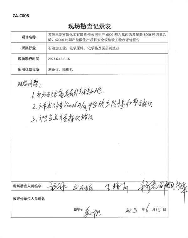 常熟三爱富氟化工有限责任公司年产6000吨六氟丙烯及配套8000吨四氟乙烯、52000吨副产盐酸生产项目安全设施符合设计要求,具备安全设施竣工验收条件。 |