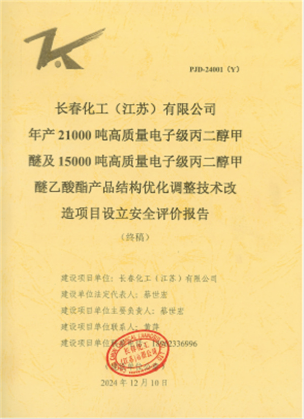长春化工(江苏)有限公司年产21000吨高质量电子级丙二醇甲醚及15000吨高质量电子级丙二醇甲醚乙酸酯产品结构优化调整技术改造项目设立安全评价报告