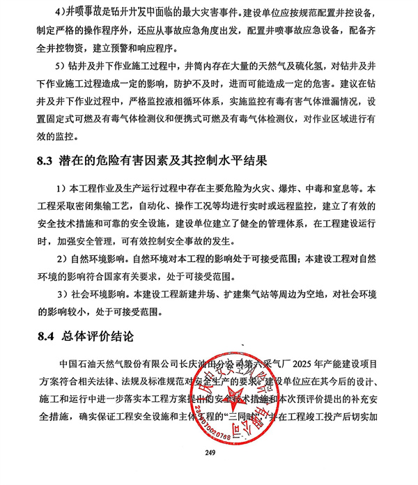 中国石油天然气股份有限公司长庆油田分公司第六采气厂2025年产能建设项目方案符合相关法律、法规及标准规范对安全生产的要求。建设单位应在其今后的设计、施工和运行中进一步落实本工程方案提出的安全技术措施和本次预评价提出的补充安全措施,确实保证工程安全设施和主体工程的“三同时”,并在工程竣工投产后切实加强安全生产管理,以实现工程安全、平稳运行,采取安全对策措施后,建设项目潜在的危险、有害因素能够得到控制。建设项目依据设计方案建成后,能达到有关法律、法规及标准规定的安全要求。 |