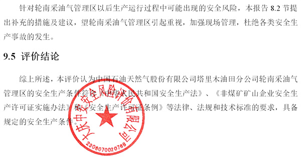 本评价认为中国石油天然气股份有限公司塔里木油田分公司轮南采油气管理区的安全生产条件符合《中华人民共和国安全生产法》、《非煤矿矿山企业安全生产许可证实施办法》和《安全生产许可证条例》等法律、法规和技术标准的要求,具备规定的安全生产条件。 |