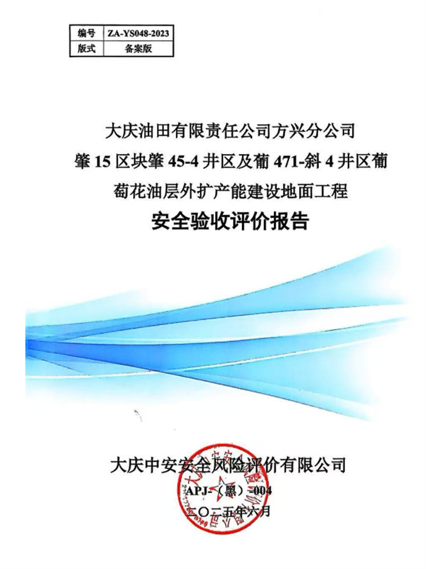 大庆油田有限责任公司方兴分公司肇15区块肇45-4井区及葡471-斜4井区葡萄花油层外扩产能建设地面工程安全验收评价 |