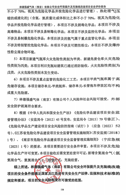 林德强盛气体(南京)有限公司安全环保提升及充装线改造项目的安全条件能满足国家及江苏省有关安全生产法律、法规和技术标准的规定和要求,项目的安全风险程度在可接受的范围。 |