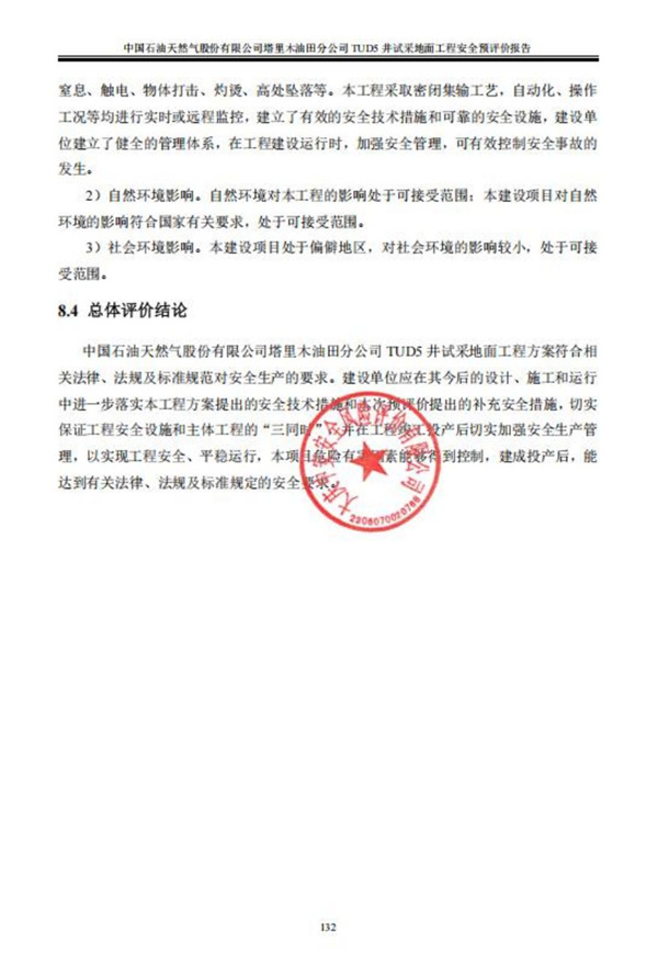 中国石油天然气股份有限公司塔里木油田分公司 TUD5 井试采地面工程方案 符合相关法律、法规及标准规范对安全生产的要求。建设单位应在其今后的 设计、施工和运行中进一步落实本工程方案提出的安全技术措施和本次预评 价提出的补充安全措施,切实保证工程安全设施和主体工程的“三同时 ”, 并在工程竣工投产后切实加强安全生产管理, 以实现工程安全、平稳运行, 本项目危险有害因素能够得到控制,建成投产后,能达到有关法律、法规及 标准规定的安全要求。 |