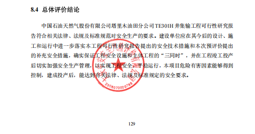 中国石油天然气股份有限公司塔里木油田分公司TE301H井集输工程可行性研究报告符合相关法律、法规及标准规范对安全生产的要求。建设单位应在其今后的设计、施工和运行中进一步落实本工程可行性研究报告提出的安全技术措施和本次预评价提出的补充安全措施,确实保证工程安全设施和主体工程的“三同时”,并在工程竣工投产后切实加强安全生产管理,以实现工程安全、平稳运行,本项目危险有害因素能够得到控制,建成投产后,能达到有关法律、法规及标准规定的安全要求。 |