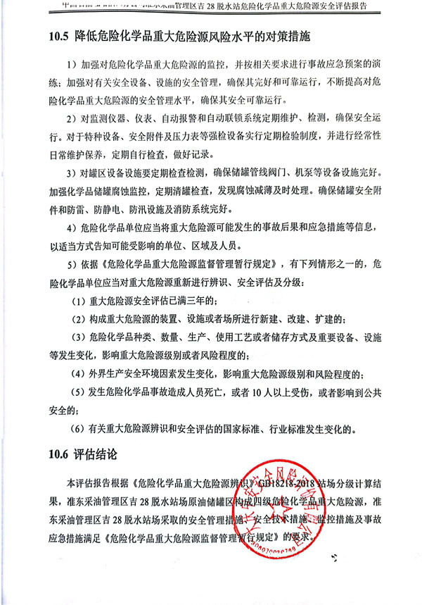 本评估报告根据《危险化学品重大危险源辨识》GB18218-2018站场分级计算结果,准东采油管理区吉28脱水站场原油储罐区构成四级危险化学品重大危险源,准东采油管理区吉28脱水站场采取的安全管理措施、安全技术措施、监控措施及事故应急措施满足《危险化学品重大危险源监督管理暂行规定》的要求。 |