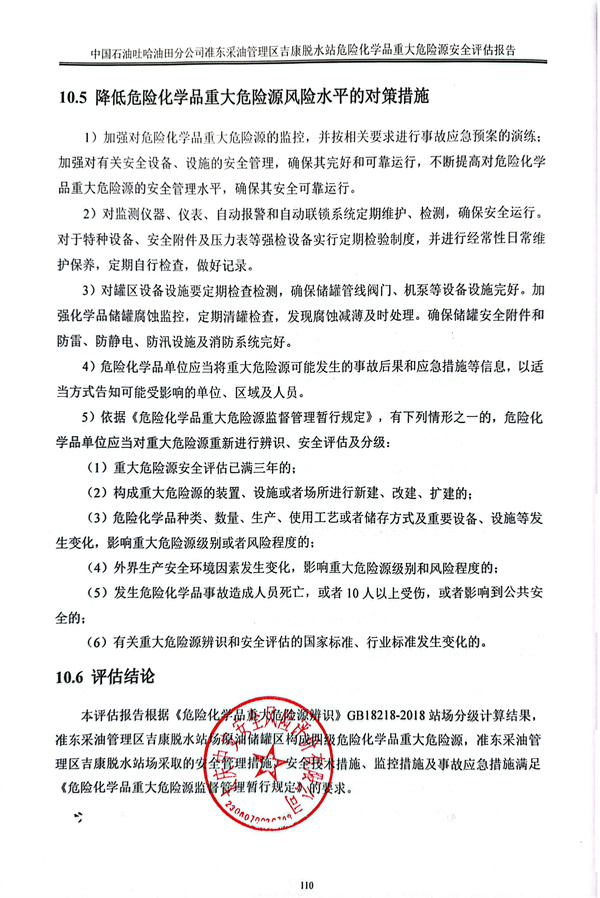 本评估报告根据《危险化学品重大危险源辨识》GB18218-2018站场分级计算结果,准东采油管理区吉康脱水站场原油储罐区构成四级危险化学品重大危险源,准东采油管理区吉康脱水站场采取的安全管理措施、安全技术措施、监控措施及事故应急措施满足《危险化学品重大危险源监督管理暂行规定》的要求。 |