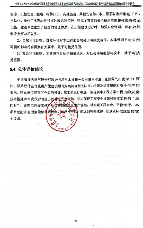 中国石油天然气股份有限公司塔里木油田分公司塔里木油田克拉苏气田克深31区块白垩系巴什基奇克组产能建设项目方案符合相关法律、法规及标准规范对安全生产的要求。建设单位应在其今后的设计、施工和运行中进一步落实本工程方案中提出的安全技术措施和本次预评价提出的补充安全措施,切实保证工程安全设施和主体工程的“三同时”,并在工程竣工投产后切实加强安全生产管理,以实现工程安全、平稳运行,本项目危险有害因素能够得到控制,建成投产后,能达到有关法律、法规及标准规定的安全要求。 |