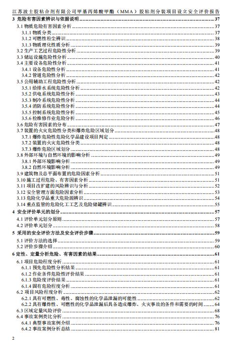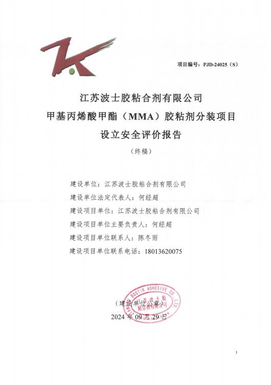 江苏波士胶粘合剂有限公司甲基丙烯酸甲酯(MMA)胶粘剂分装项目 设立安全评价报告