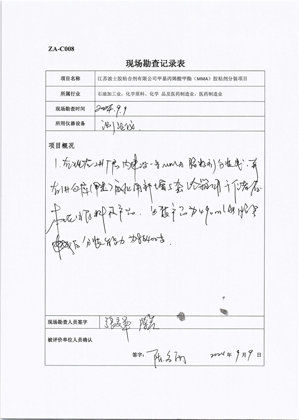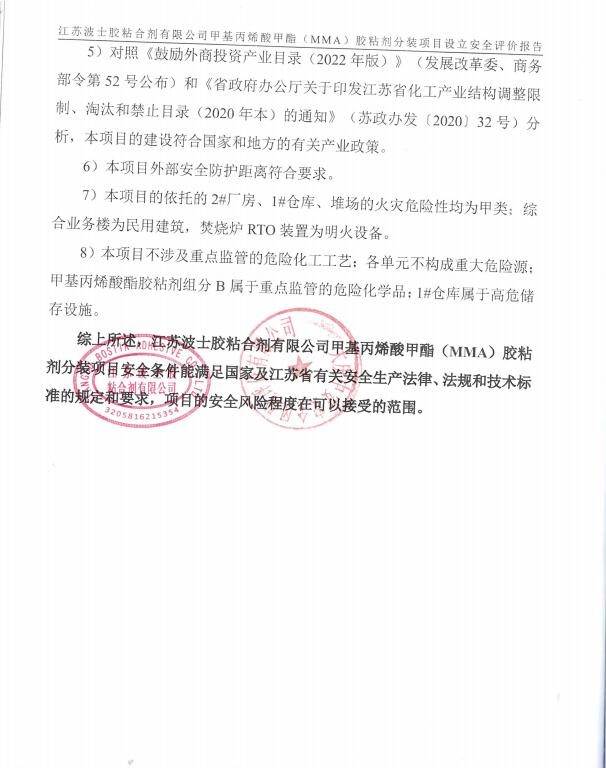 江苏波士胶粘合剂有限公司甲基丙烯酸甲酯(MMA)胶粘剂分装项目安全条件能满足国家及江苏省有关安全生产法律、法规和技术标准的规定和要求,项目的安全风险程度在可以接受的范围。 |
