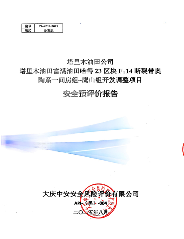 塔里木油田公司塔里木油田富满油田哈得23区块FI14断裂带奥陶系一间房组~鹰山组开发调整项目安全预评价报告
