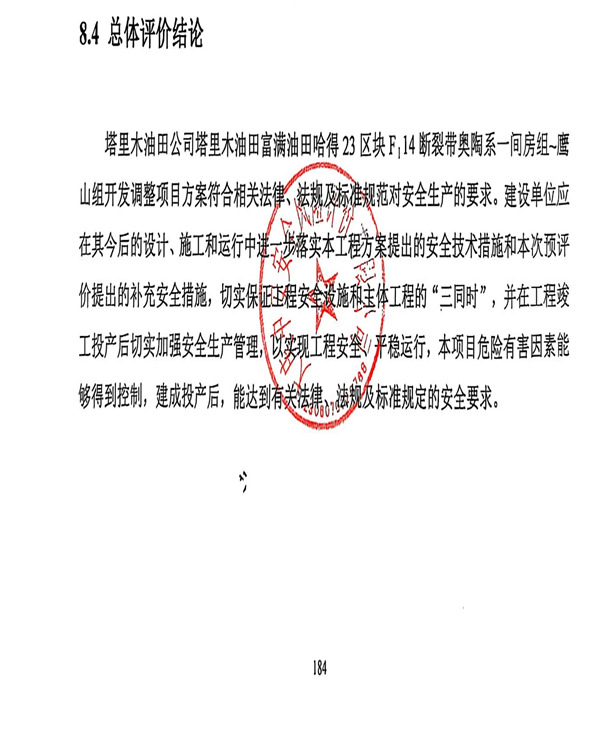塔里木油田公司塔里木油田富满油田哈得23区块FⅠ14断裂带奥陶系一间房组~鹰山组开发调整项目方案符合相关法律、法规及标准规范对安全生产的要求。建设单位应在其今后的设计、施工和运行中进一步落实本工程方案提出的安全技术措施和本次预评价提出的补充安全措施,切实保证工程安全设施和主体工程的“三同时”,并在工程竣工投产后切实加强安全生产管理,以实现工程安全、平稳运行,本项目危险有害因素能够得到控制,建成投产后,能达到有关法律、法规及标准规定的安全要求。 |