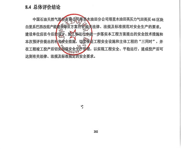 中国石油天然气股份有限公司塔里木油田分公司塔里木油田英买力气田英买46区块白垩系巴西改组产能建设项目方案符合相关法律、法规及标准规范对安全生产的要求。建设单位应在今后的设计、施工和运行中进一步落实本工程方案提出的安全技术措施和本次预评价提出的补充安全措施,切实保证工程安全设施和主体工程的“三同时”,并在工程竣工投产后切实加强安全生产管理,以实现工程安全、平稳运行,建成投产后可达到有关法律、法规及标准规定的安全要求。 |
