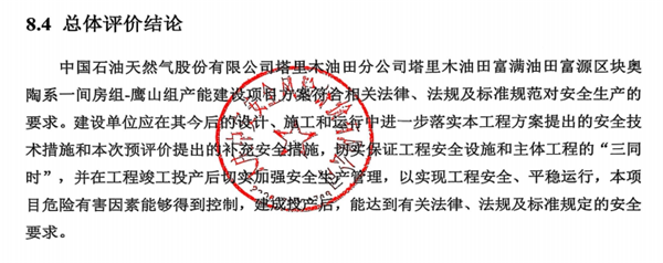 中国石油天然气股份有限公司塔里木油田分公司塔里木油田富满油田富源区块奥陶系一间房组-鹰山组产能建设项目方案符合相关法律、法规及标准规范对安全生产的要求。建设单位应在其今后的设计、施工和运行中进一步落实本工程方案提出的安全技术措施和本次预评价提出的补充安全措施,切实保证工程安全设施和主体工程的“三同时”,并在工程竣工投产后切实加强安全生产管理,以实现工程安全、平稳运行,本项目危险有害因素能够得到控制,建成投产后,能达到有关法律、法规及标准规定的安全要求。 |