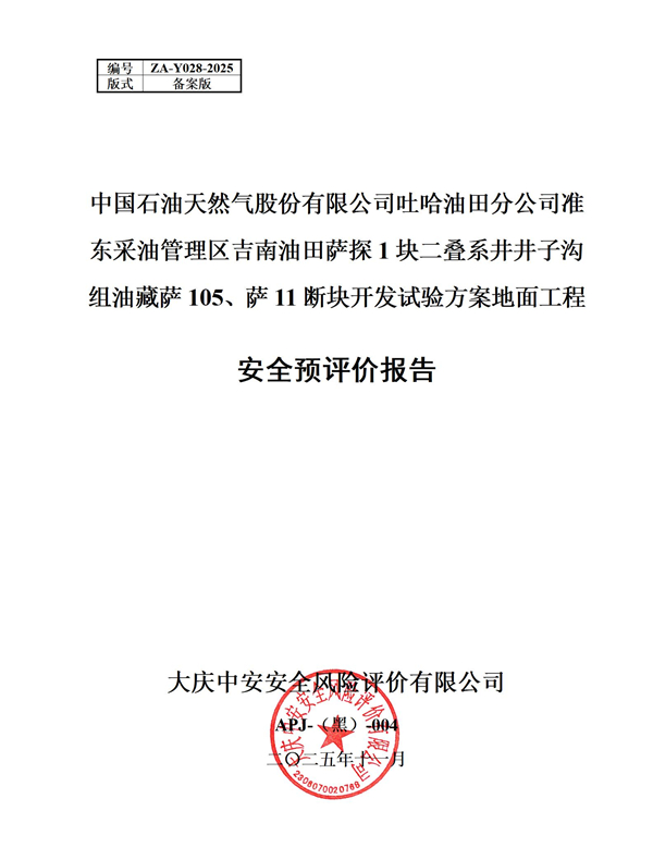 中国石油天然气股份有限公司吐哈油田分公司准东采油管理区吉南油田萨探1块二叠系井井子沟组油藏萨105、萨11断块开发试验方案地面工程安全预评价