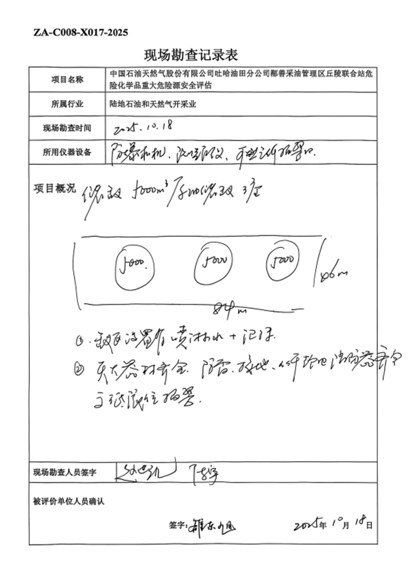 核实丘陵联合站所在区域位置、平面布置的符合性,勘察原油储罐区储罐容量、防火堤及与重大危险源相关的安全管理措施、安全技术措施和安全监控设施。 |