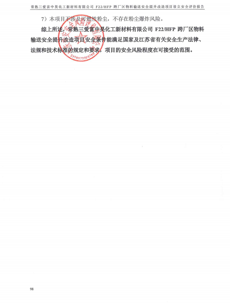 常熟三爱富中昊化工新材料有限公司F22/HFP跨厂区物料输送安全提升改造项目安全条件能满足国家及江苏省有关安全生产法律、法规和技术标准的规定和要求,项目的安全风险程度在可接受的范围。 |