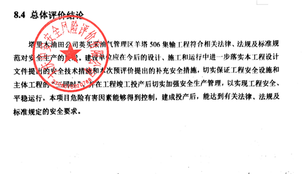 塔里木油田公司英买采油气管理区羊塔506集输工程符合相关法律、法规及标准规范对安全生产的要求。建设单位应在今后的设计、施工和运行中进一步落实本工程设计文件提出的安全技术措施和本次预评价提出的补充安全措施,切实保证工程安全设施和主体工程的“三同时”,并在工程竣工投产后切实加强安全生产管理,以实现工程安全、平稳运行,本项目危险有害因素能够得到控制,建成投产后,能达到有关法律、法规及标准规定的安全要求。 |