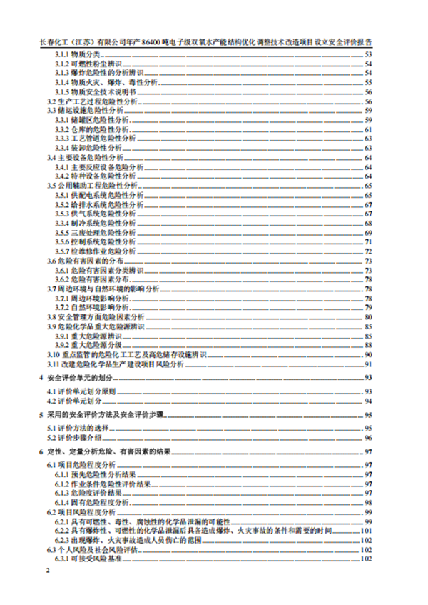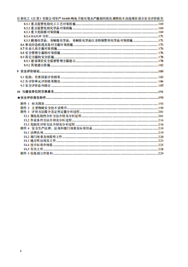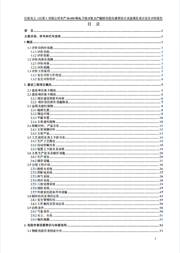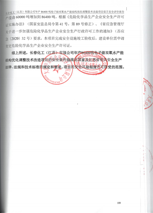 长春化工(江苏)有限公司年产 86400 吨电子级双氧水产能结构优化调整项目安全条件能满足国家及江苏省有关安全生产法律、法规和技术标准的规定和要求,项目的安全风险程度在可以接受的范围。 |