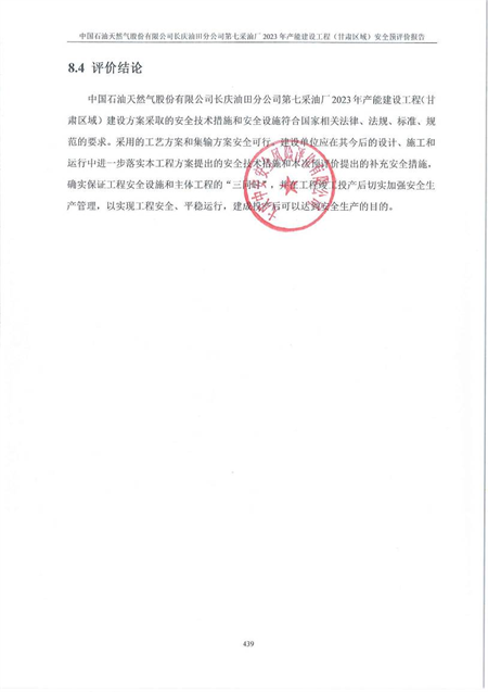 中国石油天然气股份有限公司长庆油田分公司第七采油厂2023年产能建设工程(甘肃区域)建设方案采取的安全技术措施和安全设施符合国家相关法律、法规、标准、规范的要求。采用的工艺方案和集输方案安全可行。建设单位应在其今后的设计、施工和运行中进一步落实本工程方案提出的安全技术措施和本次预评价提出的补充安全措施,确实保证工程安全设施和主体工程的“三同时”,并在工程竣工投产后切实加强安全生产管理,以实现工程安全、平稳运行,建成投产后可以达到安全生产的目的。 |