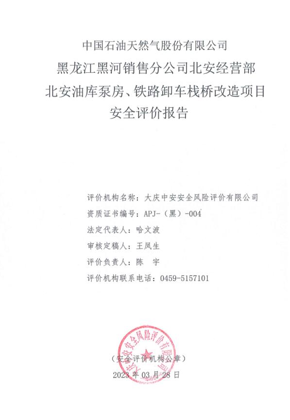 中国石油天然气股份有限公司黑龙江黑河销售分公司北安经营部北安油库泵房、铁路卸车栈桥改造项目安全评价(预) |