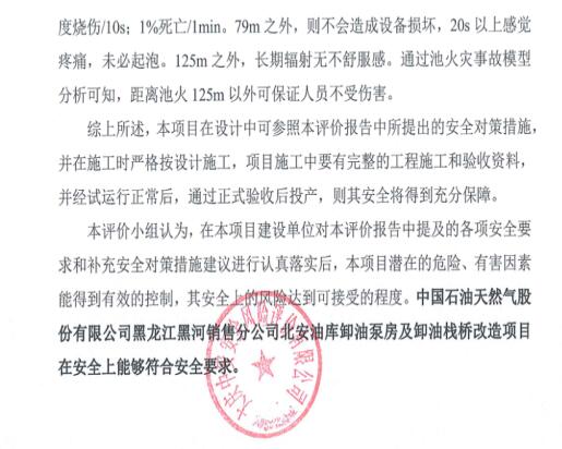 中国石油天然气股份有限公司黑龙江黑河销售分公司北安油库卸油泵房及卸油栈桥改造项目在安全上能够符合安全要求。 |