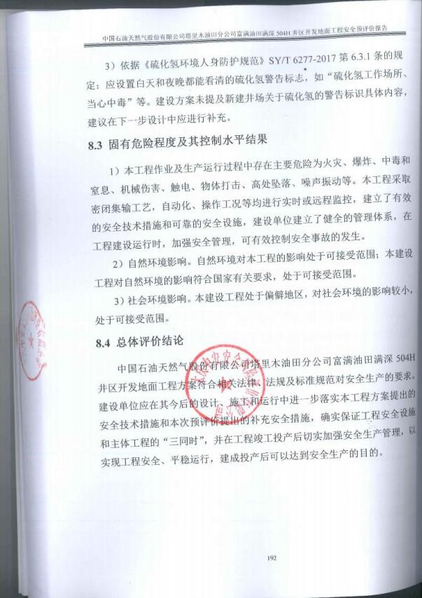 中国石油天然气股份有限公司塔里木油田分公司富满油田满深504H井区开发地面工程方案符合相关法律、法规及标准规范对安全生产的要求。建设单位应在其今后的设计、施工和运行中进一步落实本工程方案提出的安全技术措施和本次预评价提出的补充安全措施,确实保证工程安全设施和主体工程的“三同时”,并在工程竣工投产后切实加强安全生产管理,以实现工程安全、平稳运行,建成投产后可以达到安全生产的目的。 |