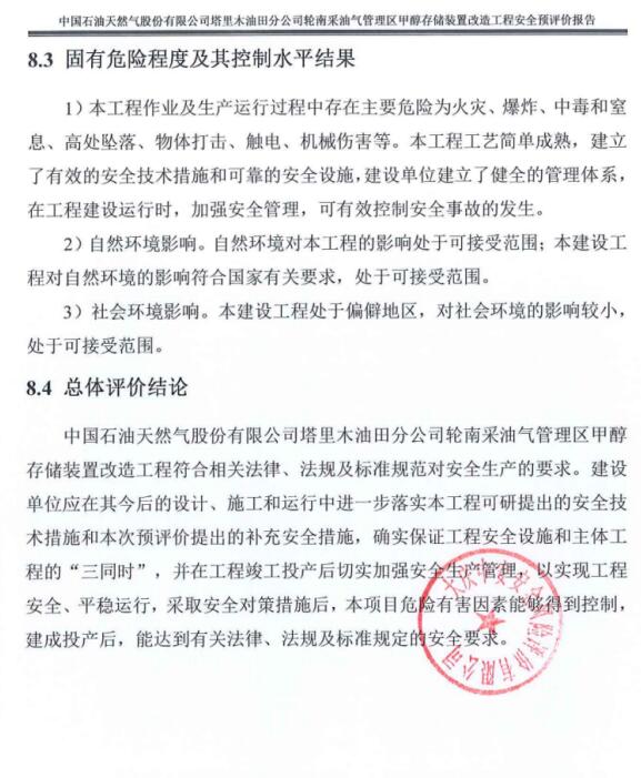 中国石油天然气股份有限公司塔里木油田分公司轮南采油气管理区甲醇存储装置改造工程符合相关法律、法规及标准规范对安全生产的要求。建设单位应在其今后的设计、施工和运行中进一步落实本工程可研提出的安全技术措施和本次预评价提出的补充安全措施,确实保证工程安全设施和主体工程的“三同时”,并在工程竣工投产后切实加强安全生产管理,以实现工程安全、平稳运行,采取安全对策措施后,本项目危险有害因素能够得到控制,建成投产后,能达到有关法律、法规及标准规定的安全要求。 |