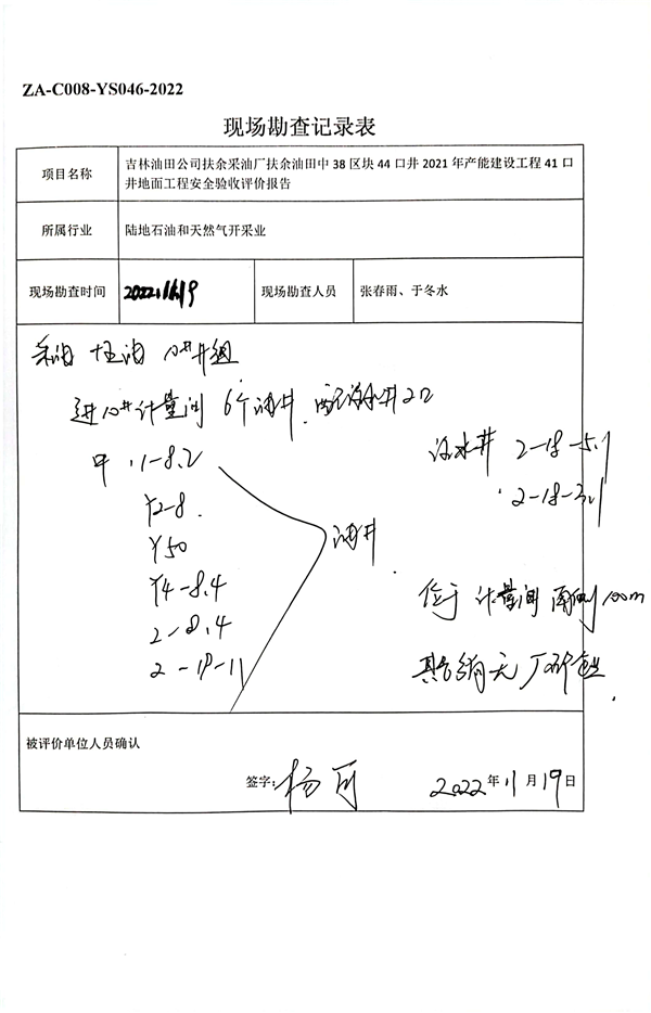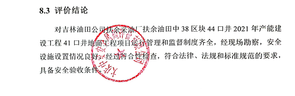 对吉林油田公司扶余采油厂扶余油田中38区块44口井2021年产能建设工程41口井地面工程项目运行管理和监督制度齐全,经现场勘察,安全设施设置情况良好,经过符合性检查,符合法律、法规和标准规范的要求,具备安全验收条件。 |
