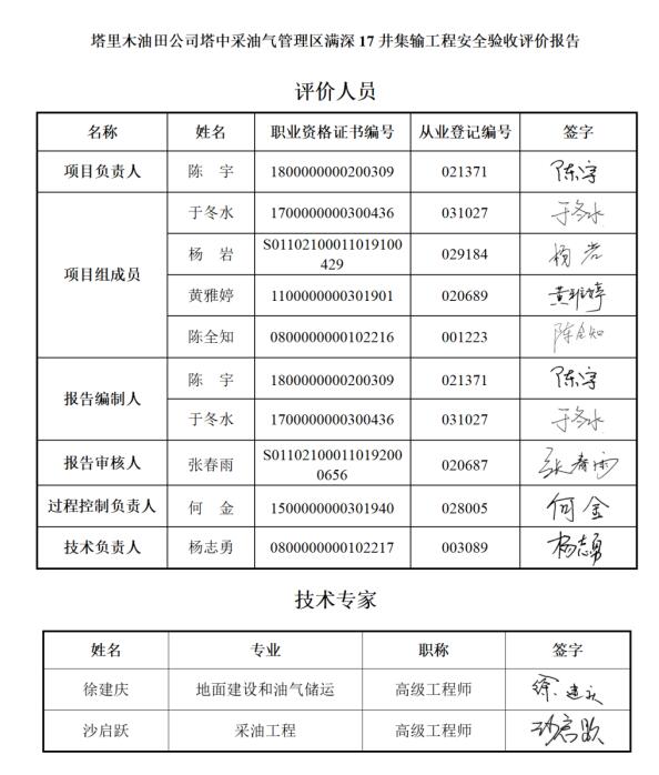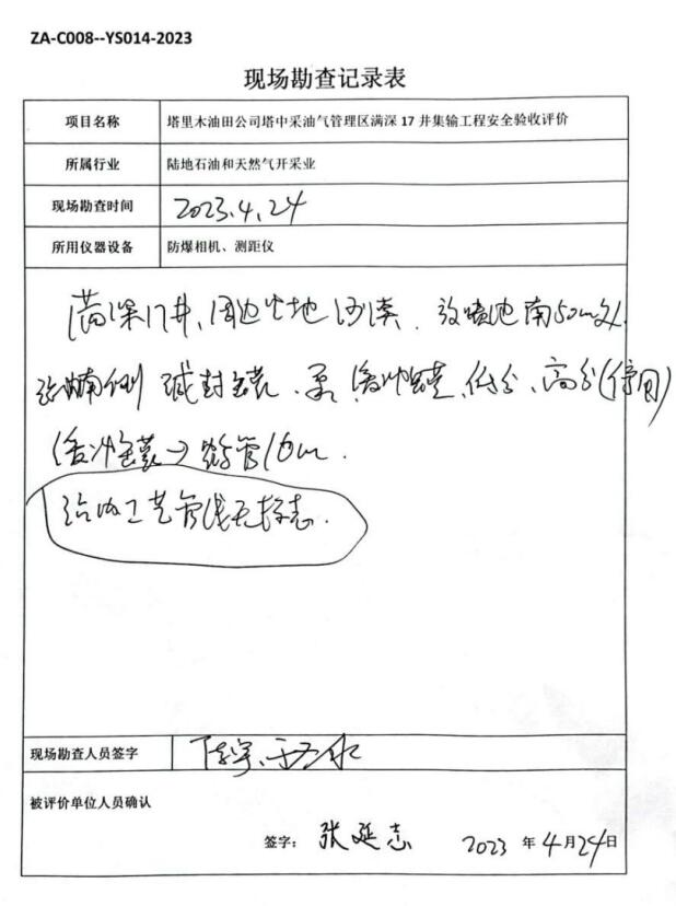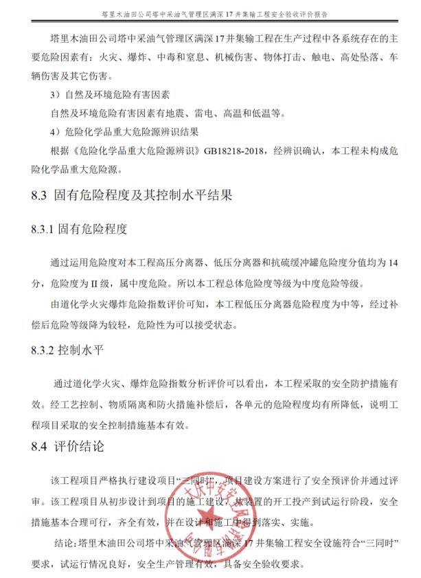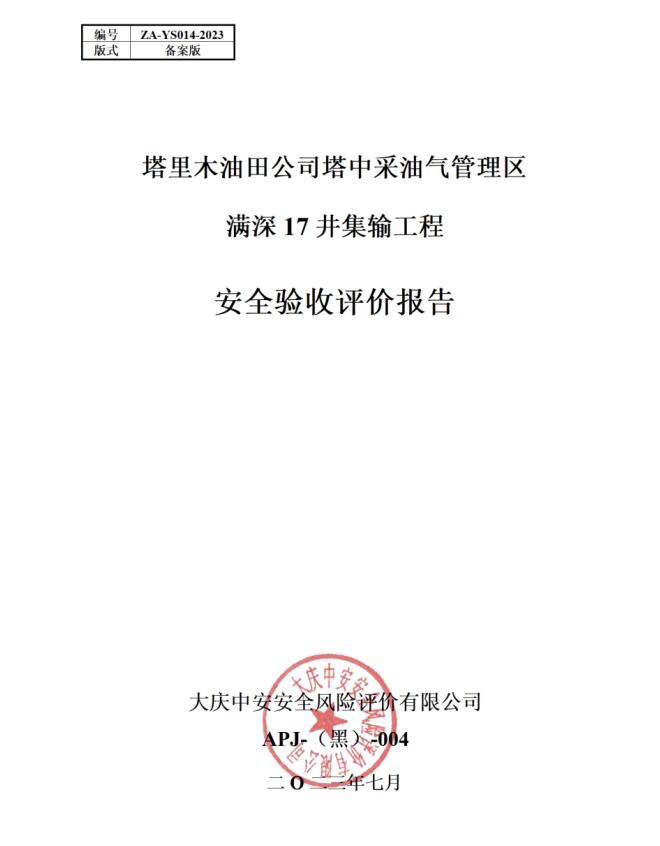 塔里木油田公司塔中采油气管理区满深17井集输工程安全验收评价 |