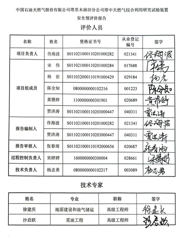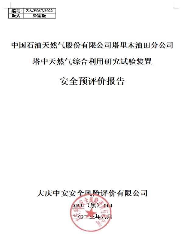 中国石油天然气股份有限公司塔里木油田分公司塔中天然气综合利用研究试验装置安全预评价报告 |