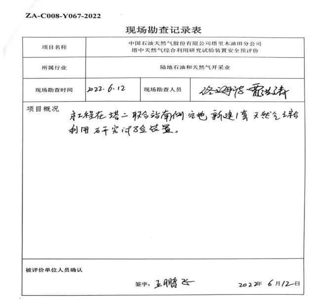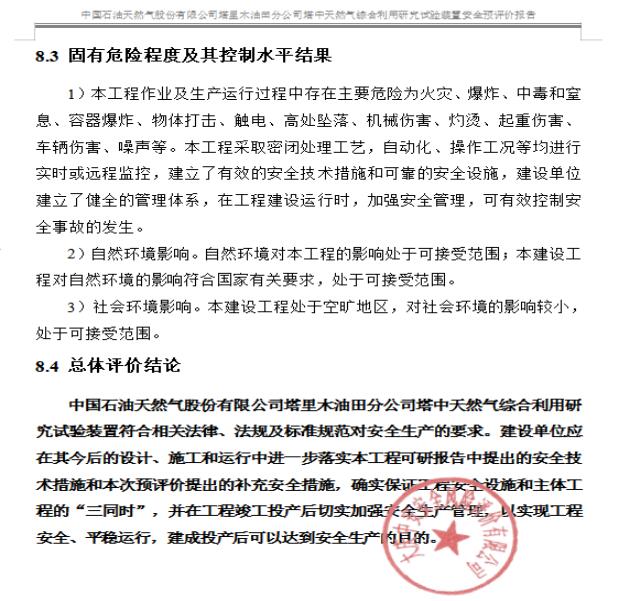 中国石油天然气股份有限公司塔里木油田分公司塔中天然气综合利用研究试验装置符合相关法律、法规及标准规范对安全生产的要求。建设单位应在其今后的设计、施工和运行中进一步落实本工程可研报告中提出的安全技术措施和本次预评价提出的补充安全措施,确实保证工程安全设施和主体工程的“三同时”,并在工程竣工投产后切实加强安全生产管理,以实现工程安全、平稳运行,建成投产后可以达到安全生产的目的。 |