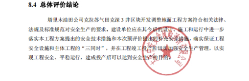 塔里木油田公司克拉苏气田克深3井区块开发调整地面工程方案符合相关法律、法规及标准规范对安全生产的要求。建设单位应在其今后的设计、施工和运行中进一步落实本工程方案提出的安全技术措施和本次预评价提出的补充安全措施,确实保证工程安全设施和主体工程的“三同时”,并在工程竣工投产后切实加强安全生产管理,以实现工程安全、平稳运行,建成投产后可以达到安全生产的目的。 |