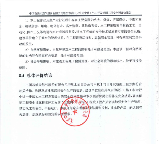 中国石油天然气股份有限公司塔里木油田分公司中秋1气田开发地面工程方案采取的安全技术措施和安全设施符合国家有关法律法规、标准、规范的要求。建设单位应在其今后的设计、施工和运行中进一步落实本工程方案提出的安全技术措施和预评价报告中提出的补充安全措施,确实保证工程安全设施和主体工程的“三同时”,并在工程竣工投产后切实加强安全生产管理,以实现工程安全、平稳运行,建成投产后可以达到安全生产的目的。 |