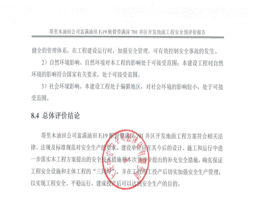 塔里木油田公司富满油田FI19断裂带满深701井区开发地面工程方案符合相关法律、法规及标准规范对安全生产的要求。建设单位应在其今后的设计、施工和运行中进一步落实本工程方案提出的安全技术措施和本次预评价提出的补充安全措施,确实保证工程安全设施和主体工程的“三同时”,并在工程竣工投产后切实加强安全生产管理,以实现工程安全、平稳运行,建成投产后可以达到安全生产的目的。 |
