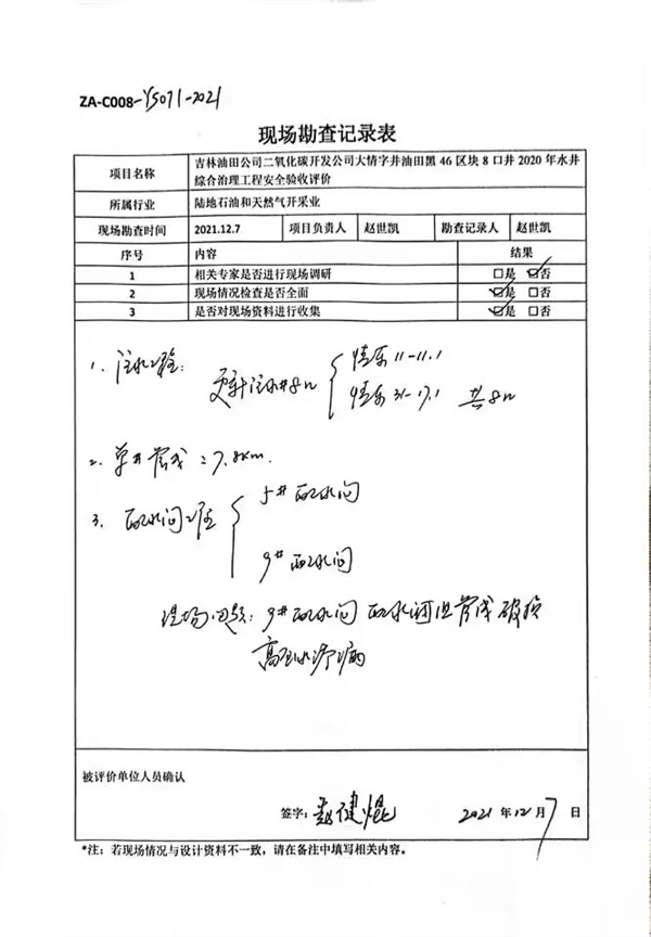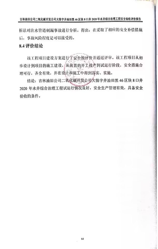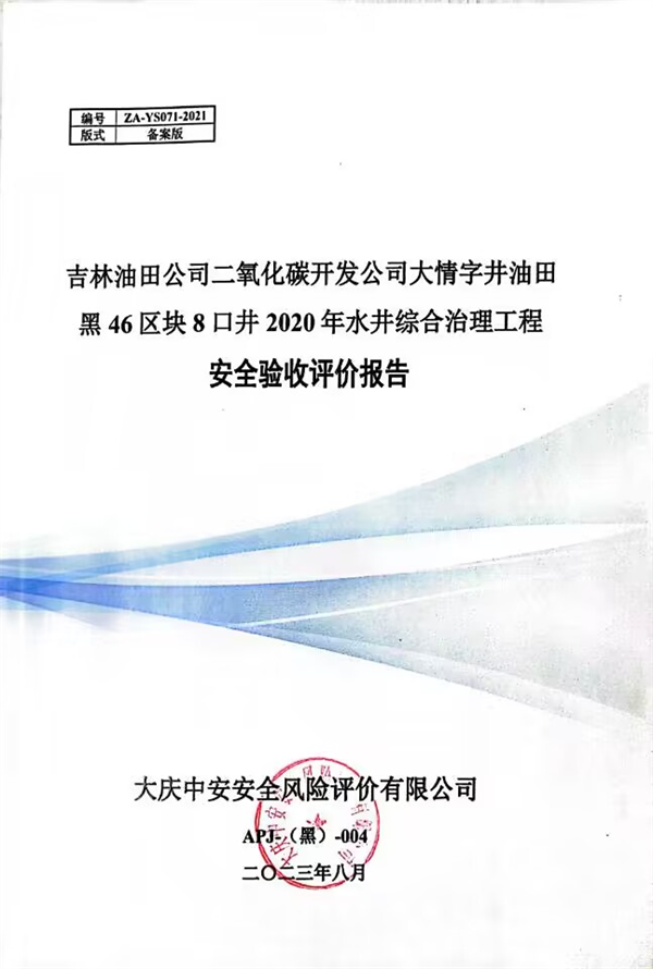 吉林油田公司二氧化碳开发公司大情字井油田黑46区块8口井2020年水井综合治理工程 安全验收评价