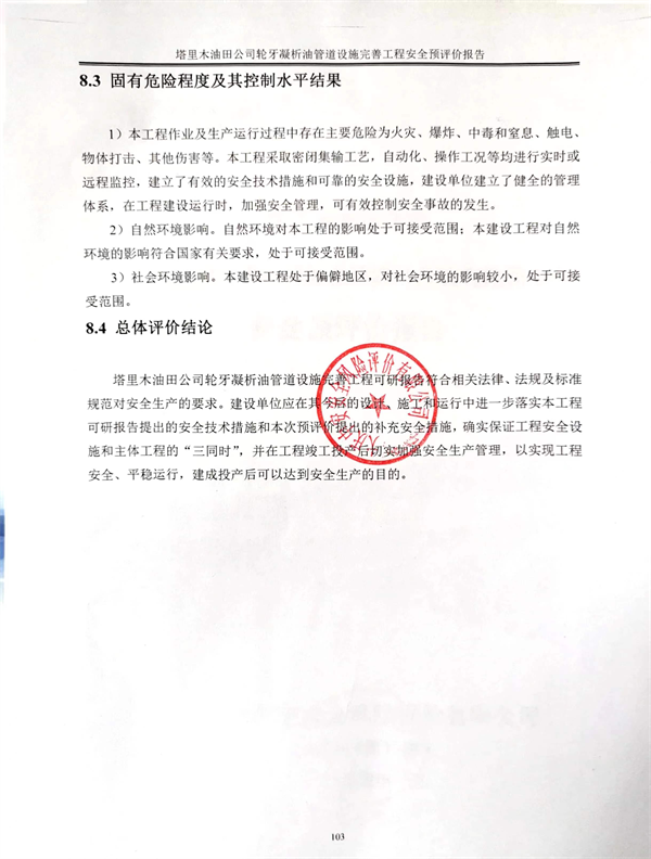 塔里木油田公司轮牙凝析油管道设施完善工程可研报告符合相关法律、法规及标准规范对安全生产的要求。建设单位应在其今后的设计、施工和运行中进一步落实本工程可研报告提出的安全技术措施和本次预评价提出的补充安全措施,确实保证工程安全设施和主体工程的“三同时”,并在工程竣工投产后切实加强安全生产管理,以实现工程安全、平稳运行,建成投产后可以达到安全生产的目的。 |