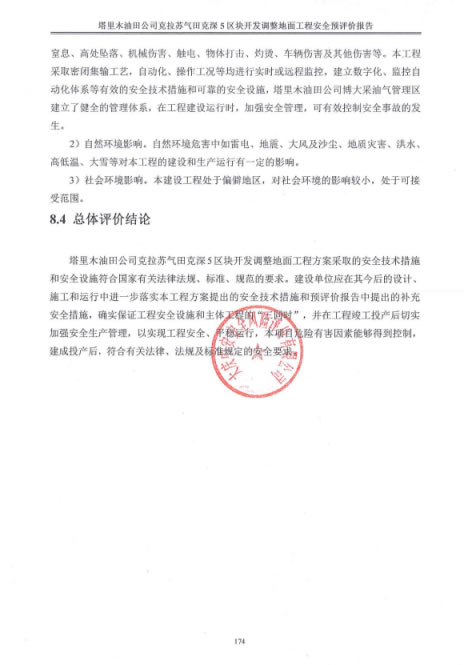 塔里木油田公司克拉苏气田克深5区块开发调整地面工程方案采取的安全技术措施和安全设施符合国家有关法律法规、标准、规范的要求。建设单位应在其今后的设计、施工和运行中进一步落实本工程方案提出的安全技术措施和预评价报告中提出的补充安全措施,确实保证工程安全设施和主体工程的“三同时”,并在工程竣工投产后切实加强安全生产管理,以实现工程安全、平稳运行,本项目危险有害因素能够得到控制,建成投产后,符合有关法律、法规及标准规定的安全要求。 |