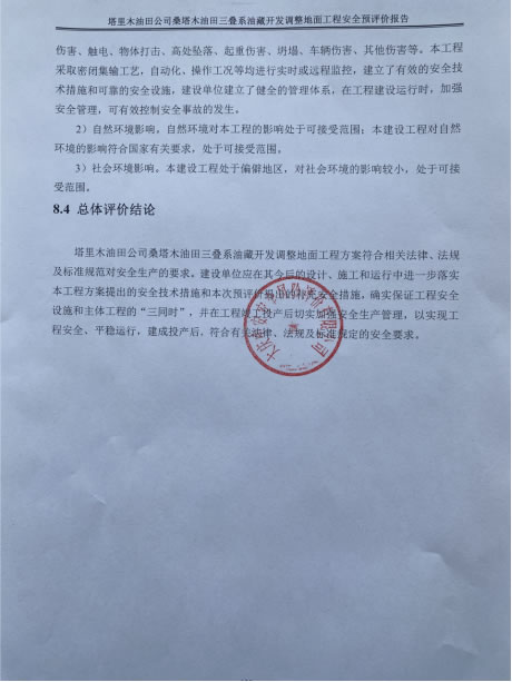 塔里木油田公司桑塔木油田三叠系油藏开发调整地面工程方案符合相关法律、法规及标准规范对安全生产的要求。建设单位应在其今后的设计、施工和运行中进一步落实本工程方案提出的安全技术措施和本次预评价提出的补充安全措施,确实保证工程安全设施和主体工程的“三同时”,并在工程竣工投产后切实加强安全生产管理,以实现工程安全、平稳运行,建成投产后,符合有关法律、法规及标准规定的安全要求。 |